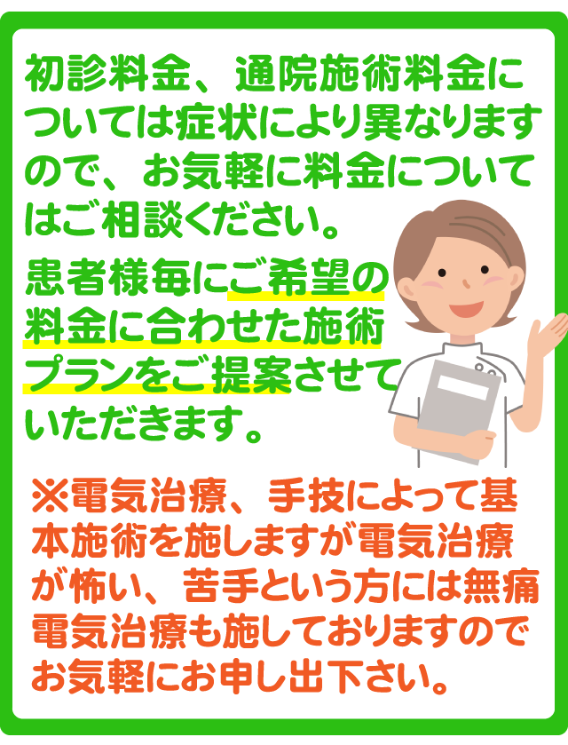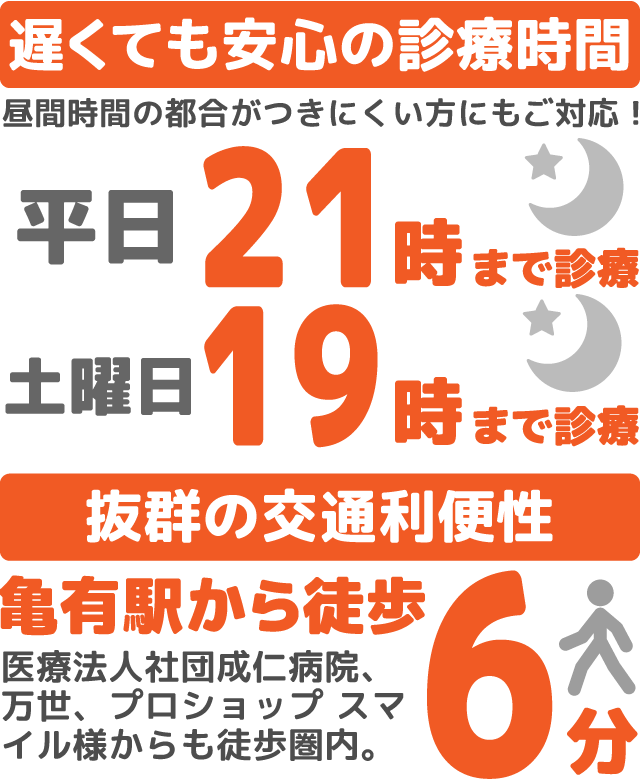 都合の良い時間にご来院頂けますので、空き時間・お仕事帰り、お買い物帰り・お子様のお迎え前等…いつでもご来院下さい!