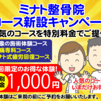 いつもご来院ありがとうございます(^^)/ 7月15日よりミナト整骨院のコースをより、患者様のご要望にそったコースへとリニューアルいたしました。 リニューアルキャンペーンとして、コース初回施術体験を特別価格1,000円で …